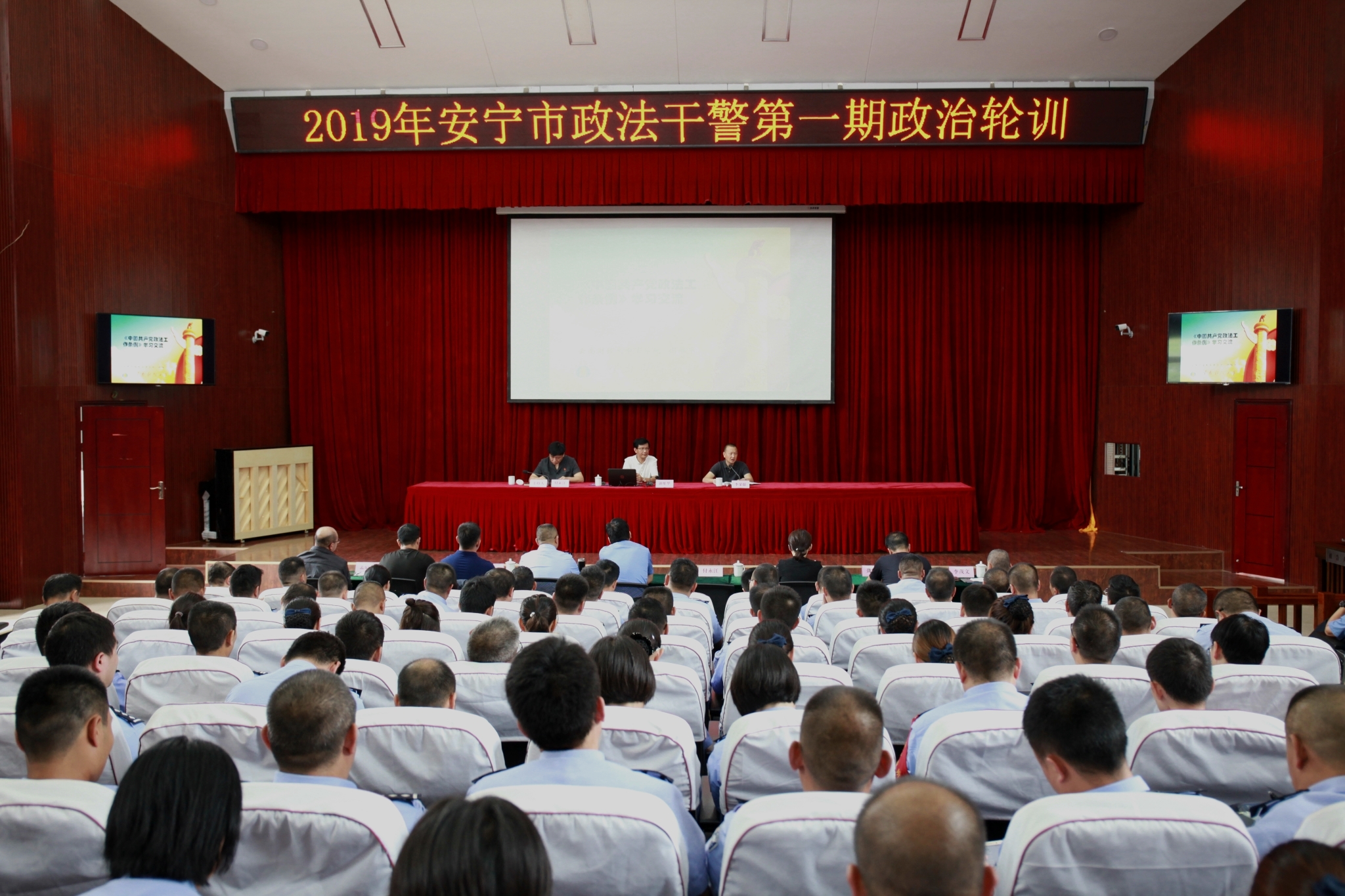 为认真贯彻落实中央、省委、昆明市委及安宁市委加强政法队伍建设的部署和要求,推进全市政法系统政治轮训工作规范化、制度化、科学化,培养造就一支绝对忠诚、绝对纯洁、绝对可靠的高素质政法队伍。2019年7月12日下午,安宁市举办了2019年全市政法干警第一期政治轮训。市委常委、市委政法委书记李荣敬,市人民法院院长付永江,市人民检察院检察长杨志刚,市公安局政委张双平,市级政法各部门班子成员、副科级以上领导干部、党组织领导干部180余人参加了培训。