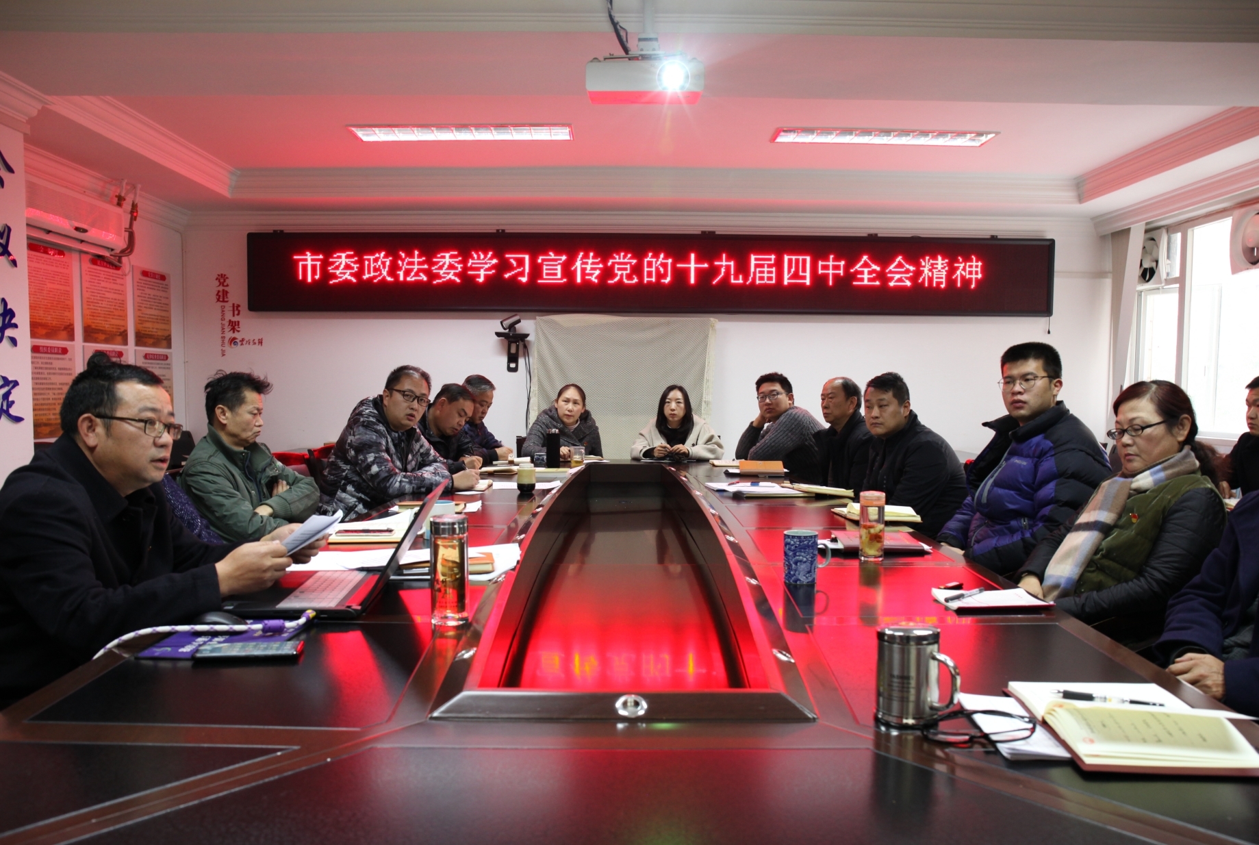 2019年12月18日上午,市委政法委组织全体党员干部职工专题学习宣传党的十九届四中全会精神。市委政法委副书记、政治处主任李自权作专题讲解。